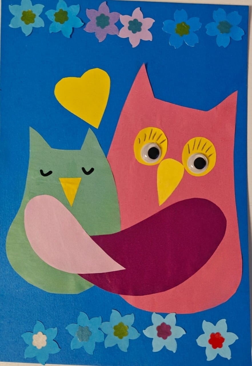 Использованные материалы - цветная бумага и цветной картон, ножницы, клей, цветы из фигурного дырокола, глазки для творчества (чёрно-белые)