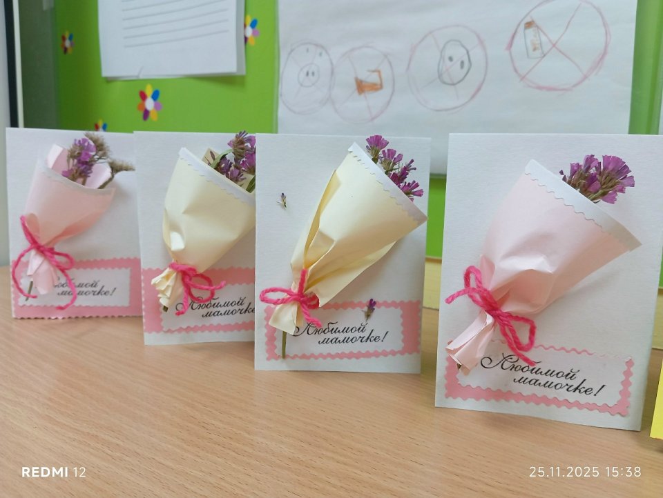 Открытки выполняли воспитанники с нарушением слуха из разновозрастной группы. Выполнена работа: картон, цветная бумага, живые цветы статица.