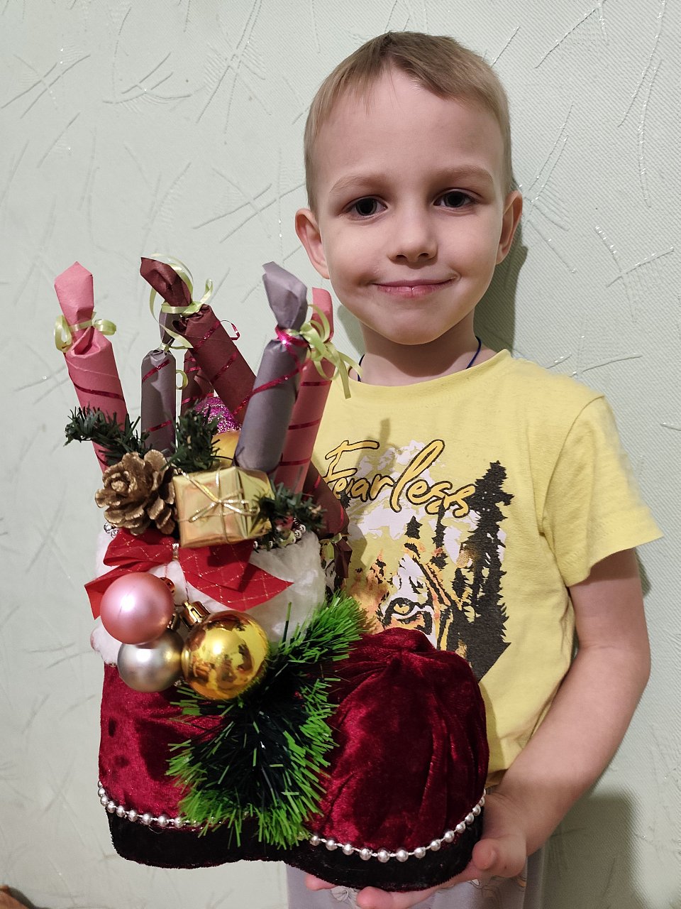 Техника исполнения:Конструирование из различных материалов (пластиковая бутылка, ткань, цветная бумага, новогодние ёлочные игрушки, природный материал - шишка)