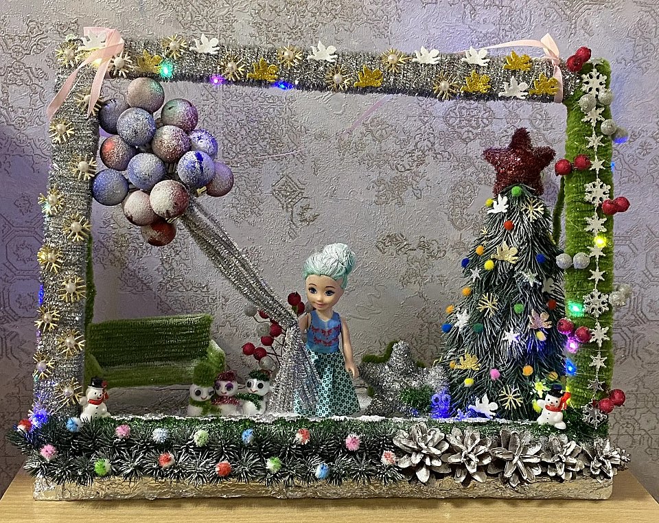Участнику 6 лет. Поделка ручная, с элементами декора из природного материала с добавлением пластиковых элементов и светящихся гирлянд