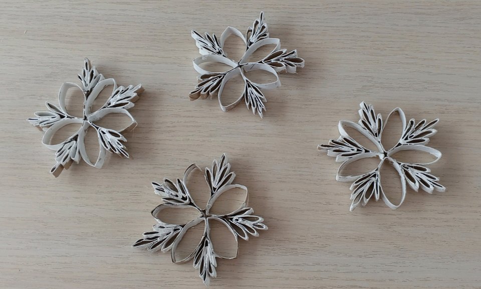 Воспитанники средней группы детского сада - 4-5 лет, снежинки сделаны из бросового материала (втулка от туалетной бумаги), клей ПВА, ножницы, белая гуашь.