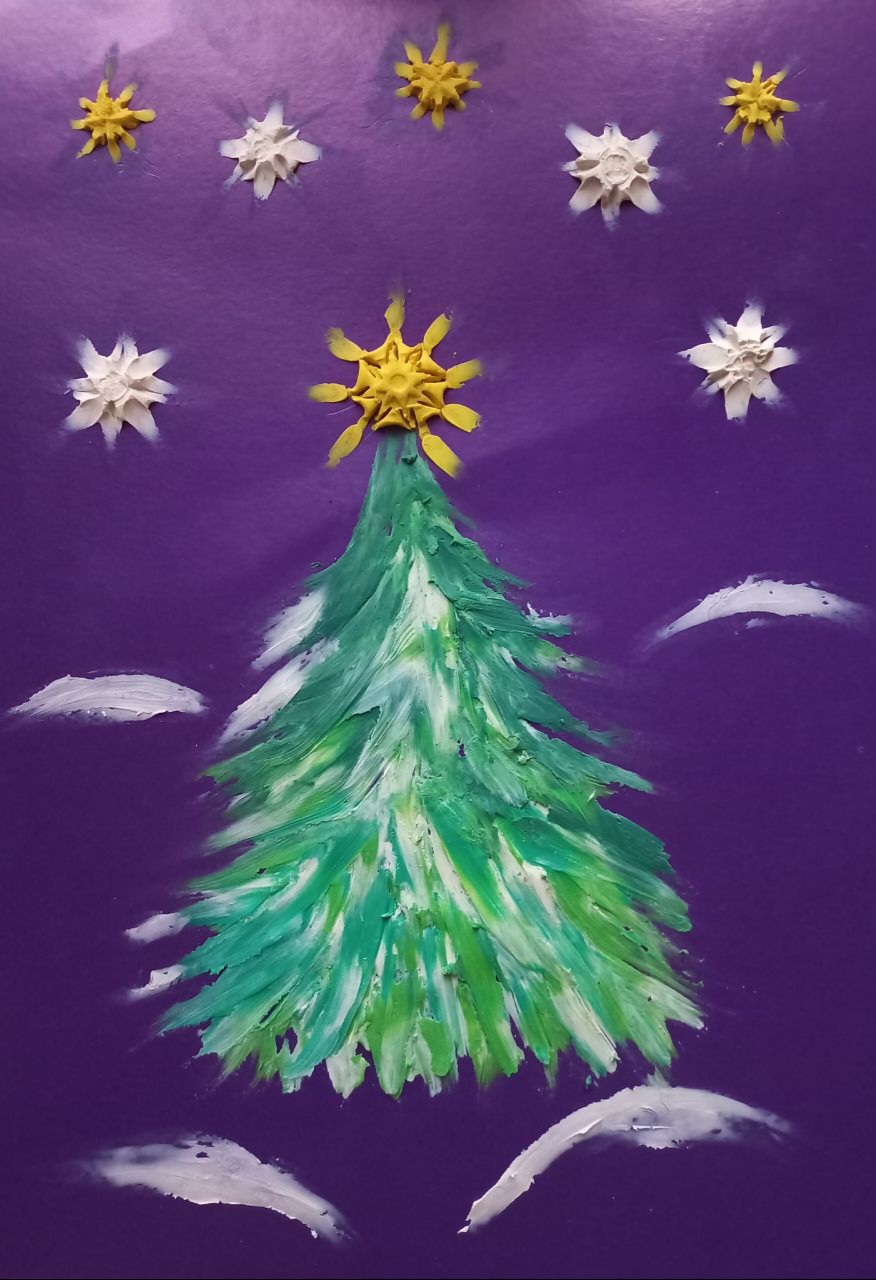 Работа выполнена воспитанницей группы компенсирующей направленности 4,5 лет в технике пластилинографии (цветной картон, пластилин, пуговицы для создания отпечатков)
