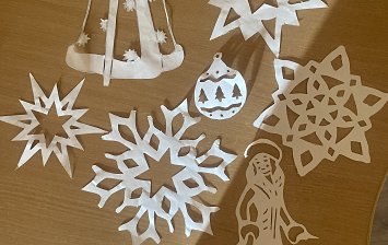 5,5 лет, поделка из картона, обоев, шишек, еловых веточек, ткани, ватных палочек, проволоки.