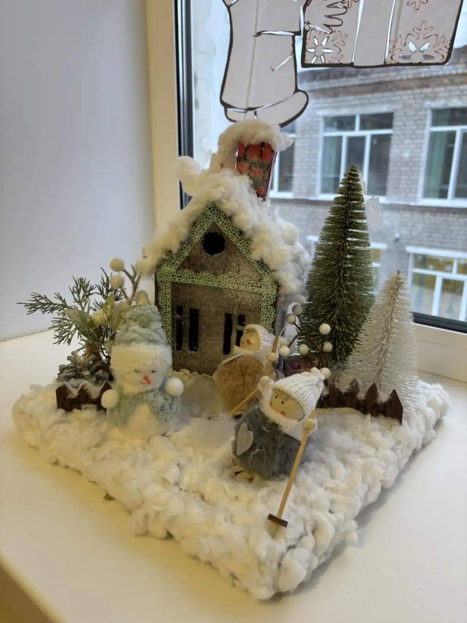 Работа выполнена из картона, ваты, декоративных элементов