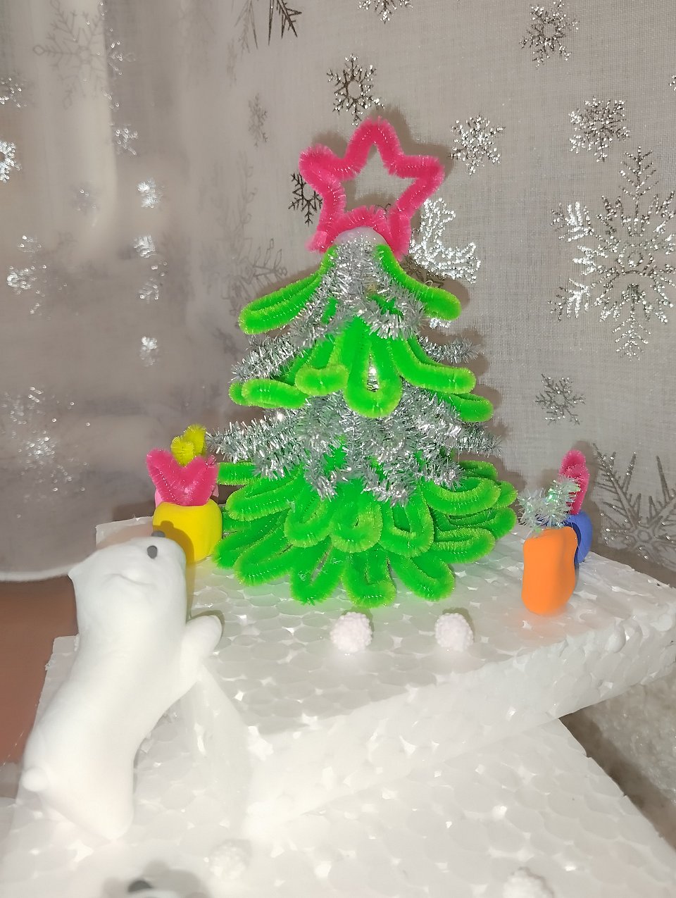Степан, 4 года (совместная работа с сестрой). Техника исполнения смешанная. В работе использована синельная проволока, пластилин и плитки пенопласта.
