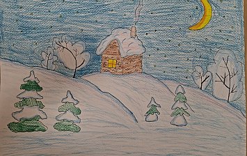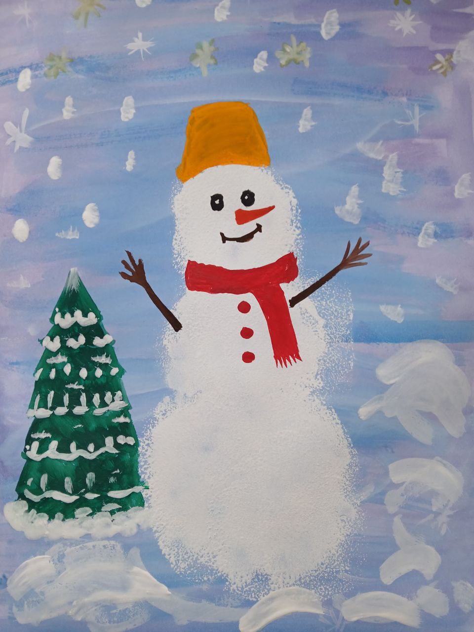 На рисунке изображено новогоднее чудо глазами ребенка . Прекрасный зимний снеговик