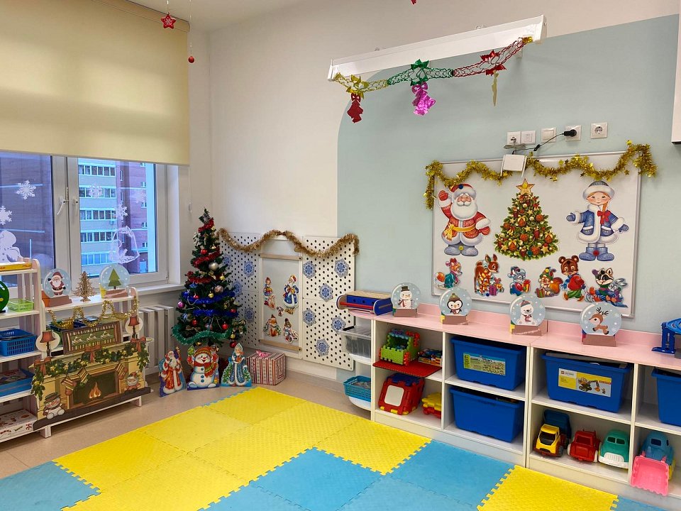 Группа украшена красочными картинками главных героев праздника, камином и праздничной елкой