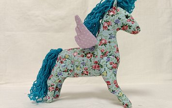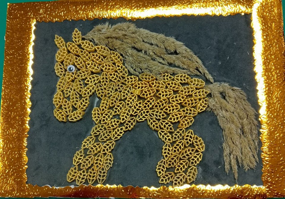 10 лет, картон, макароны в виде листьев,золотая акриловая краска, пластиковые глазки, грива и хвост из природного материала, клей пистолет