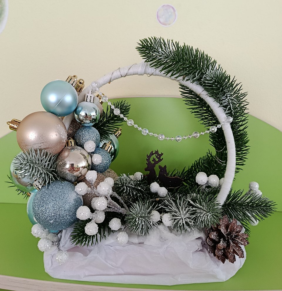 возраст - 5 лет, работа выполнена из еловых веток, шаров, бусин, ткани и шерстяных ниток