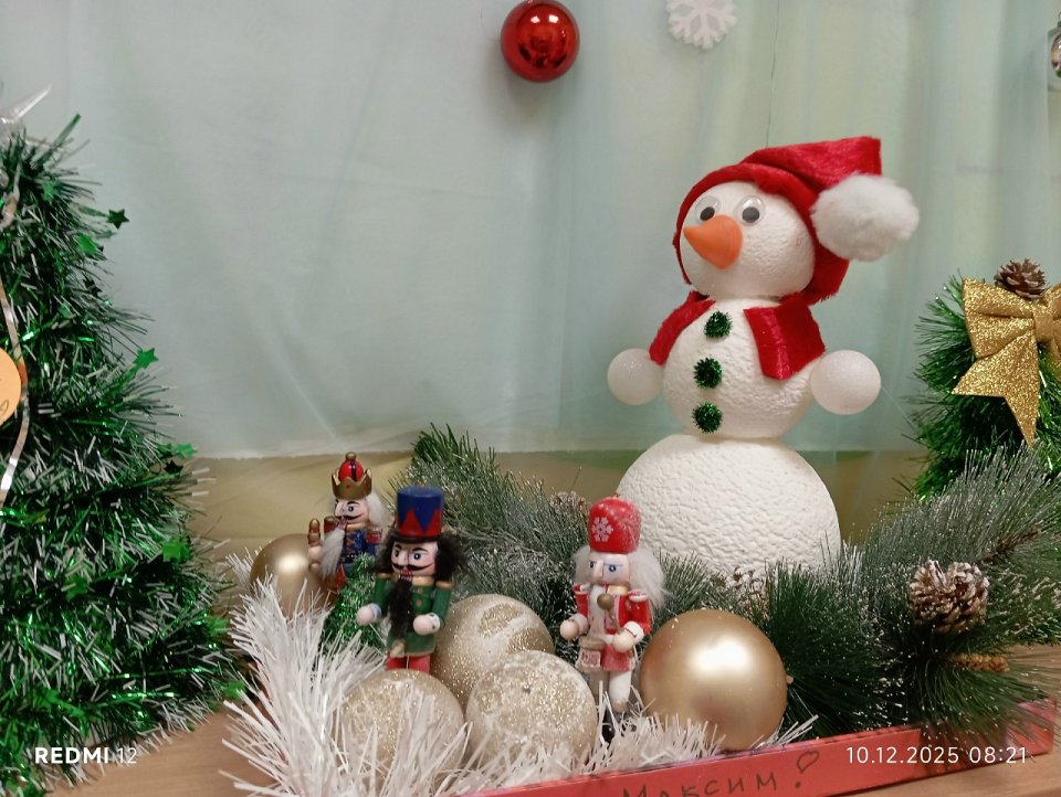 Возраст Максима 5 лет. Герои в работе были взяты из сказки Щелкунчик. Выполнена из искусственных веток, новогодних елочных шаров, деревянных солдатиков. Снеговик из шаров пенопласта.