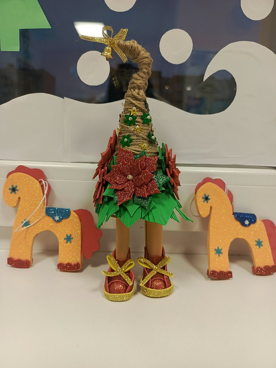 Тимофею 5 лет; работа выполнена в технике создания игрушки-поделки. Использованные материалы: пенопластовый конус, листы Fomeva, зубочистки, спажки, двусторонний скотч, гвоздики-булавки, бусины, бисер, лента, джутовый шпагат, фигурные пайетки, колокольчик.