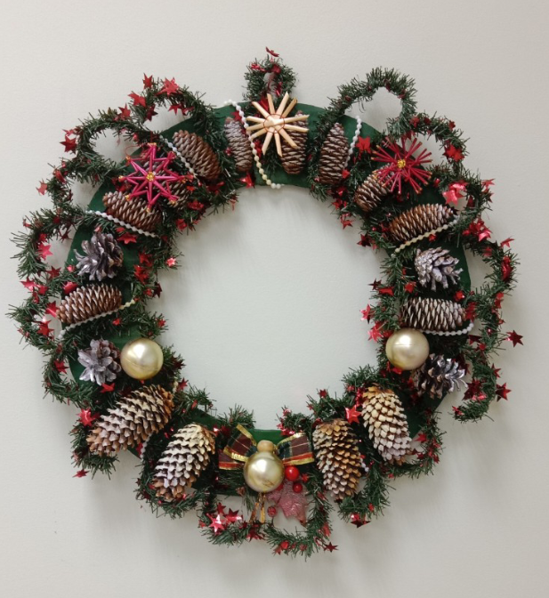 Картон, искусственные еловые ветки, шишки, шары, блёстки, украшения,клей.