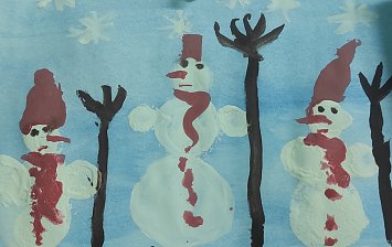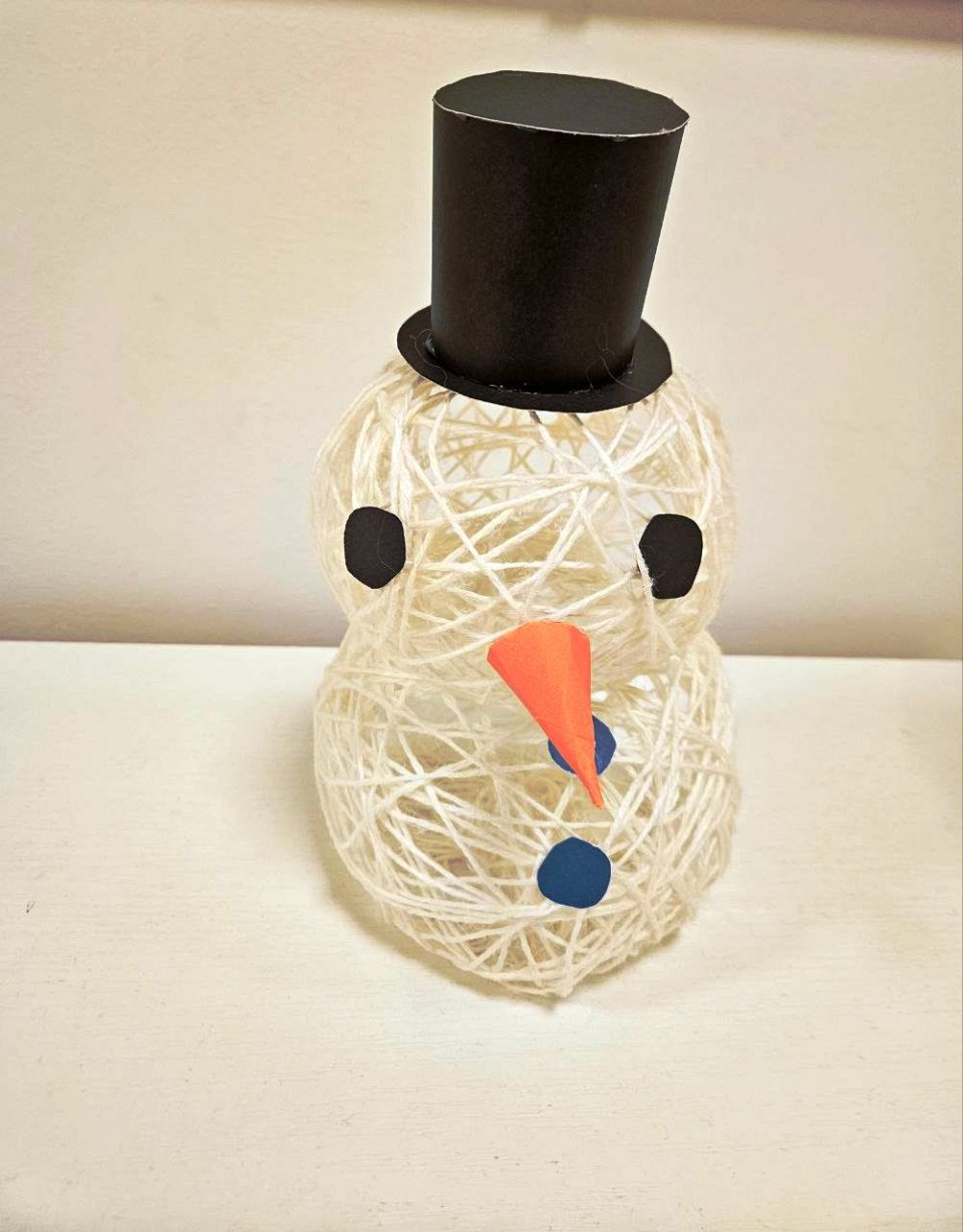 На голове снеговика находится черный цилиндр, сделанный из бумаги или картона. Глаза и пуговицы выполнены из черной бумаги, а нос — из оранжевой бумаги. Работа выполнена аккуратно, что свидетельствует о внимательности и старании автора.