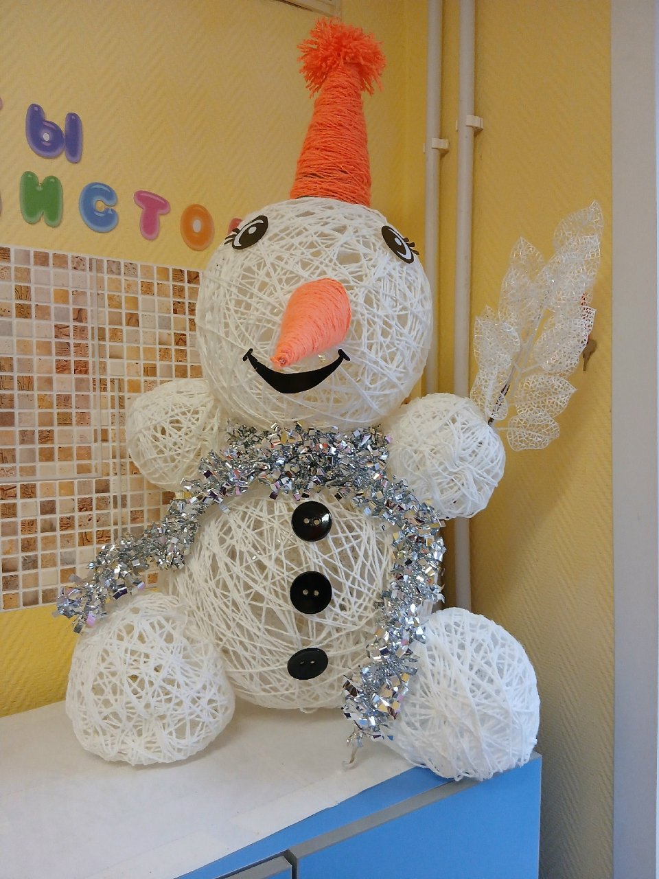 снеговик сделан из ниток и украшен пуговицами, дождиком, веточкой еловой.