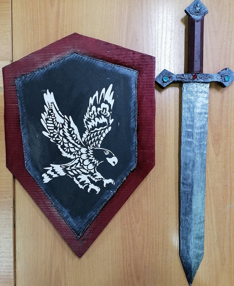 Автору 12 лет. Работа выполнена из картона. Лезвие меча покрыто шпаклевкой по дереву, ошкурено наждачной бумагой. Рукоятка украшена объемным декором из полимерной глины, который слеплен при помощи молдов. На щите рисунок нанесен при помощи трафарета и шпаклевки. Окрашено акриловыми красками.
