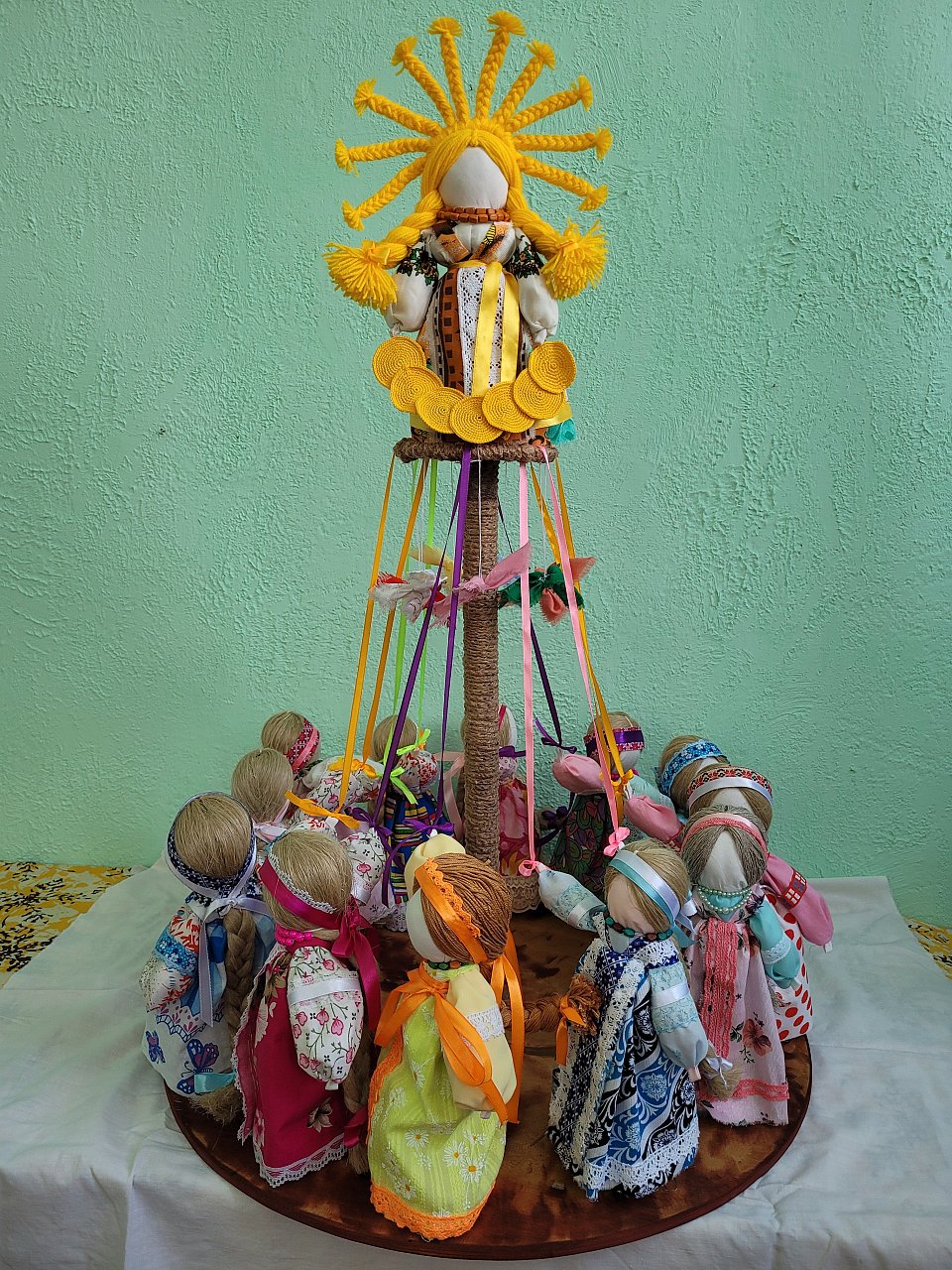 Куклы-мотанки и птички сделаны из хлопка,кружева и ваты.Вверху композиции стоит кукла-мотанка Масленница.