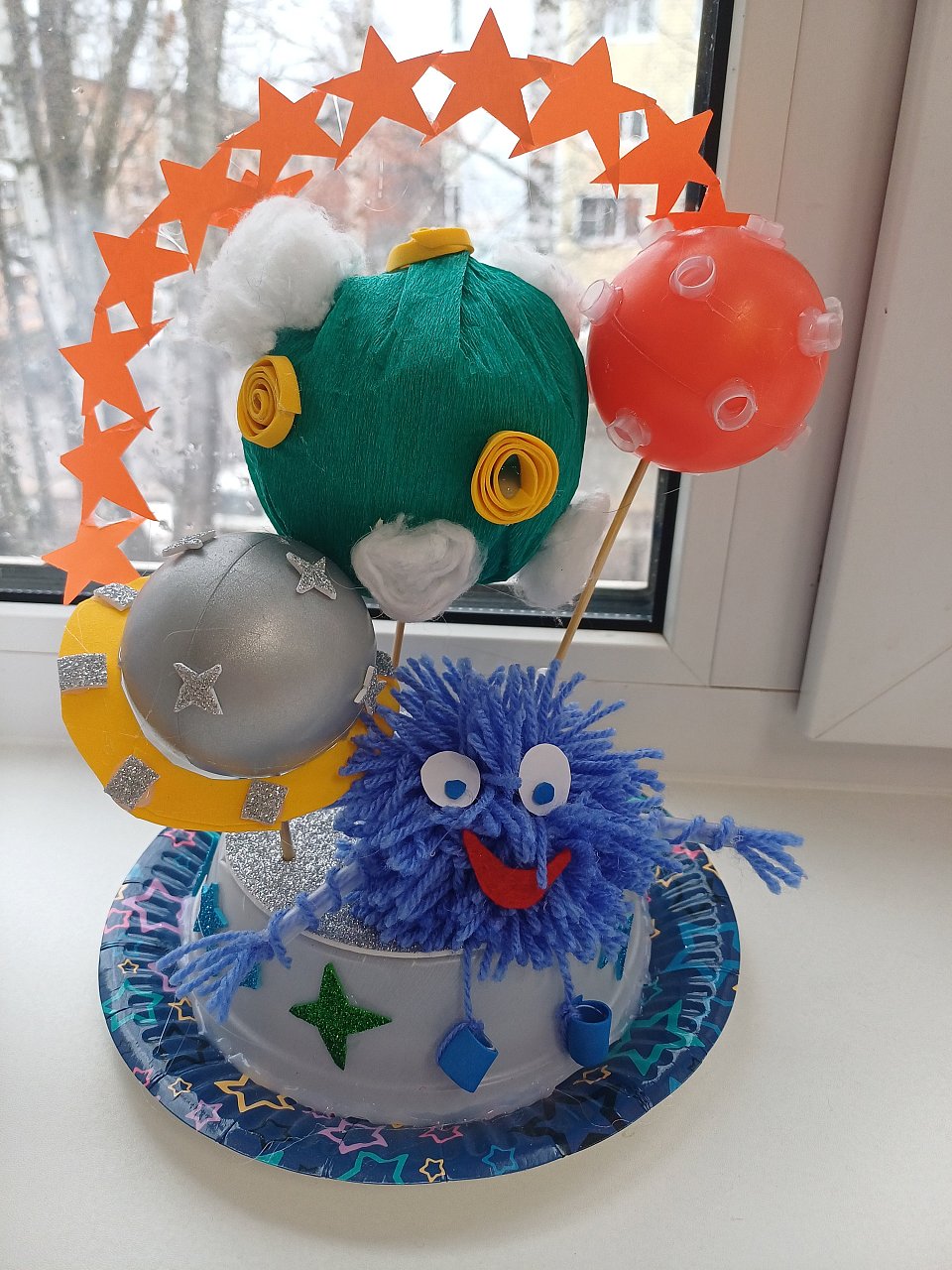 Возраст: 6 лет Поделка изготовлена из различных материалов, начиная от бумаги и заканчивая нитками для вязания или вышивки.