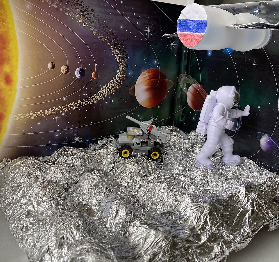 Работа создана при помощи вторсырья: коробка из под яиц, пластиковая бутылка, фольга. Также использовалась фигурка космонавта и машинки.