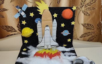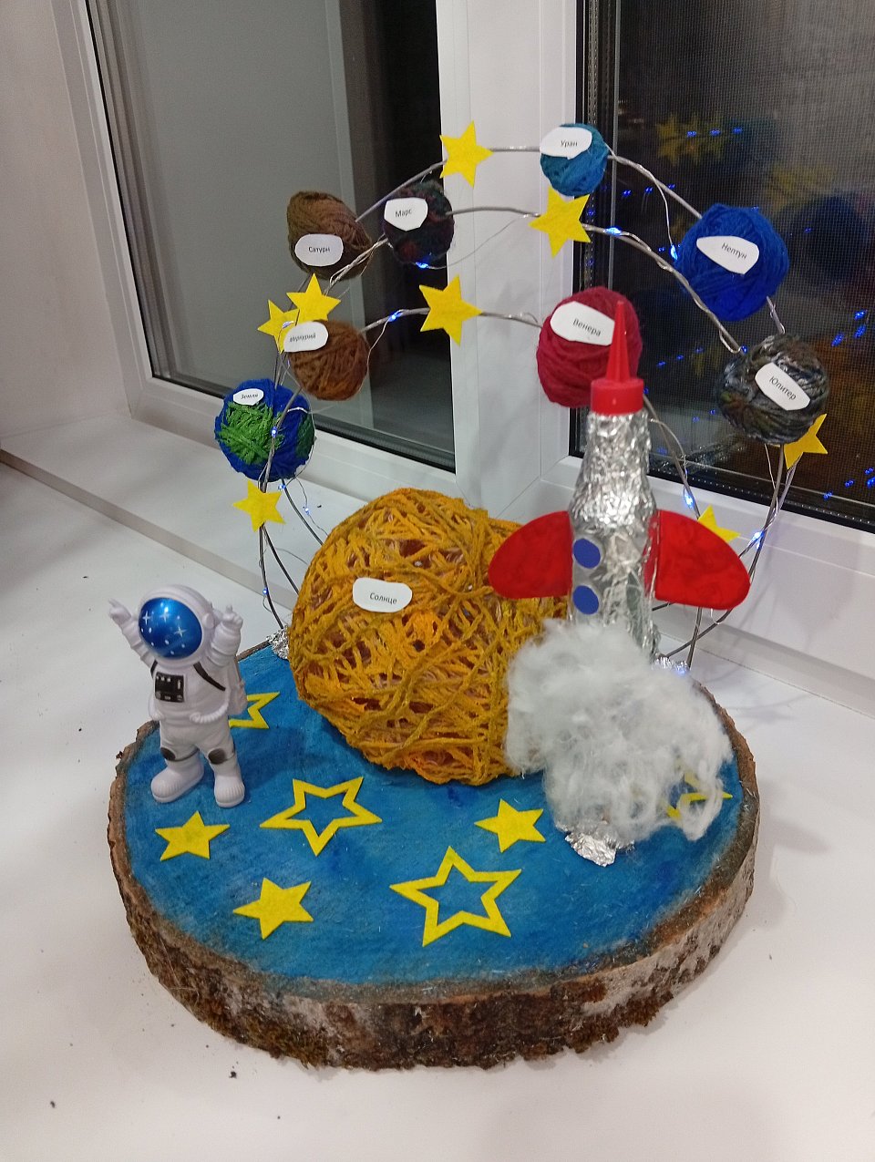 3 года, спил от дереве, проволока, саморезы вязальные нитки, воздушный шарик, звезды из фетра, ракета сделана из бутылочки, фольги, бумаги, ваты, клей пва , клей под пистолет, фигурка космонавт , гирлянда .