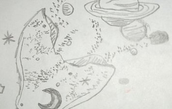 9 л, Рисунок на акварельной бумаге акриловыми красками с использованием декоративного элемента приклеенного клеем -пистолетом(шлем космонавта). Краски использовались и обычные и с перламутрово-металлическим эффектом(всего 9 цветов).