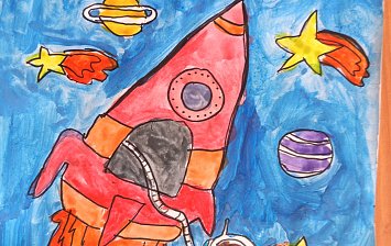 Композиция из поделок и рисунков, посвященная Дню Космонавтики. Выполнена детьми 7-8 лет.