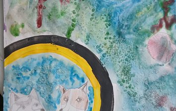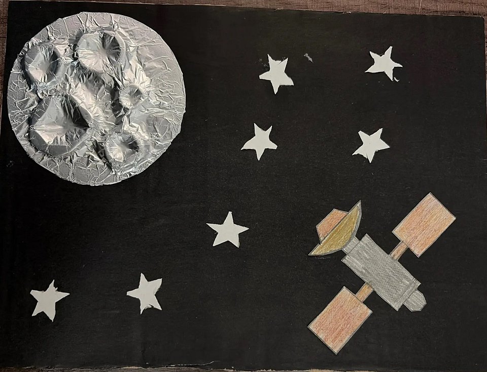 Ученик 4 класса представляет на конкурс свою работу о космосе. На ней можно увидеть, как орбитальная станция облетает Луну под мерцанием далёких звёзд. Автор старался передать своё восхищение Вселенной и мечту о будущих полётах. Техника исполнения: аппликация. Использованные материалы: картон, цветная бумага, ножницы, клей, пластилин, фольга.