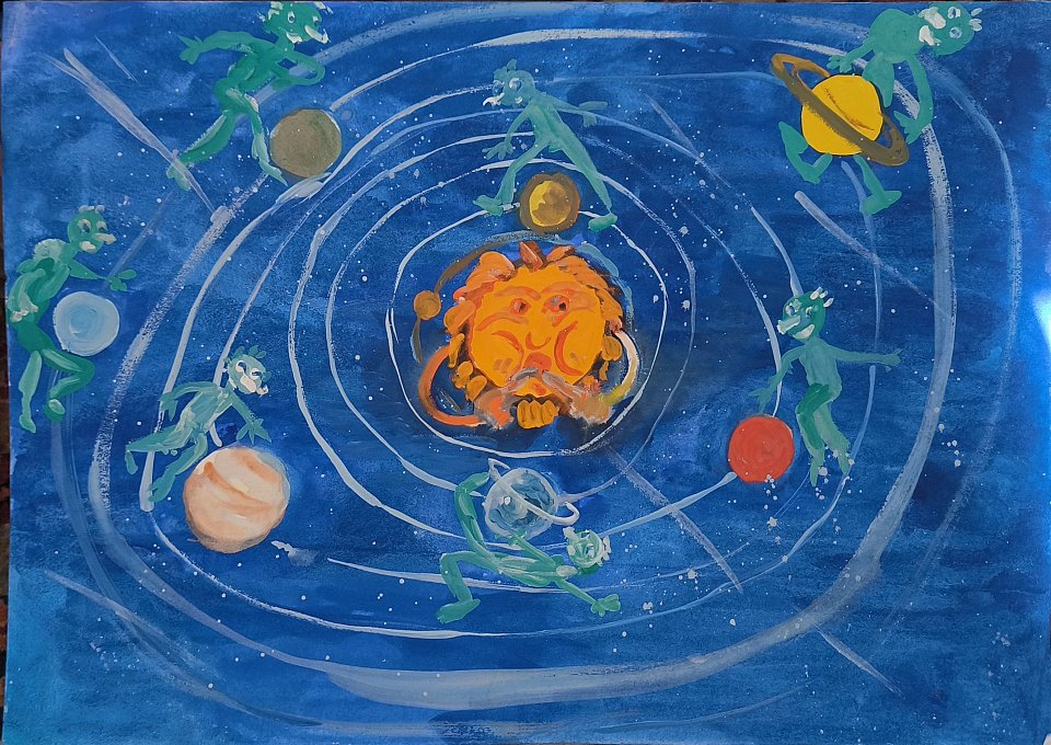 Работа выполнена учащейся школы для обучающихся с ОВЗ. Алина Карасёва изобразила смешных человечков с других планет.