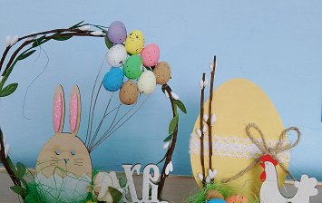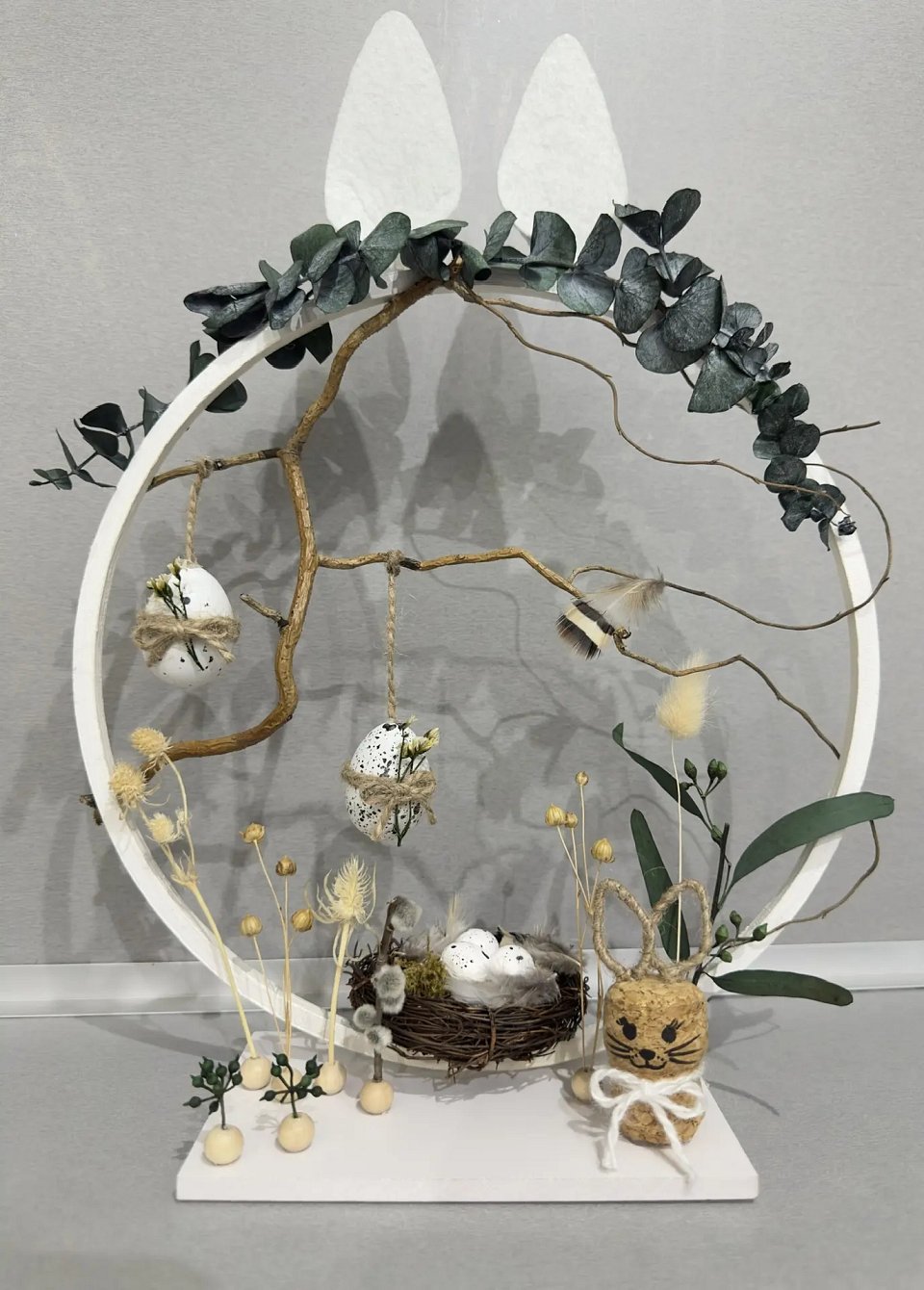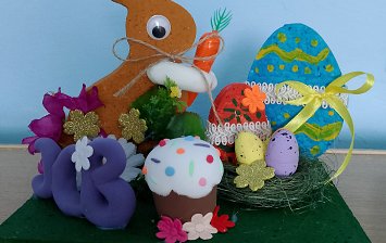 Возраст 4 года. В работе использованы: сухоцветы, клей, деревянная основа, элементы пасхального декора, нити для вязания.