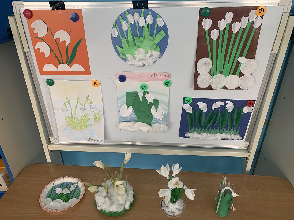 В младшей группе «Умнички» оформлена выставка детских работ «Подснежники». Работы представлены в различных техниках: плетение из бумаги и ткани, поделки из бросового материала, мозаика из бумаги, аппликация.