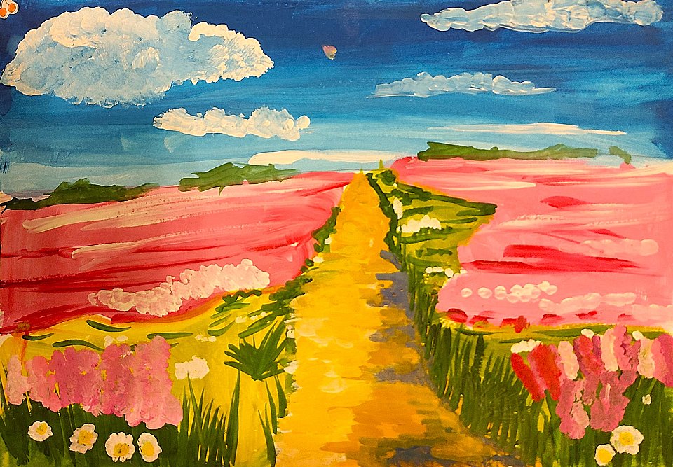 На картине с помощью акварели и гуаши изображена живописная дорога, ведущая через цветущие поля. Яркие цветы, в основном розового и белого цветов, обрамляют путь, создавая ощущение весны и радости. Небо над головой украшено пушистыми облаками, а вдали виднеются холмы, покрытые зеленью. Это произведение искусства передает атмосферу спокойствия и умиротворения, приглашая зрителя отправиться в путешествие по этому прекрасному ландшафту.