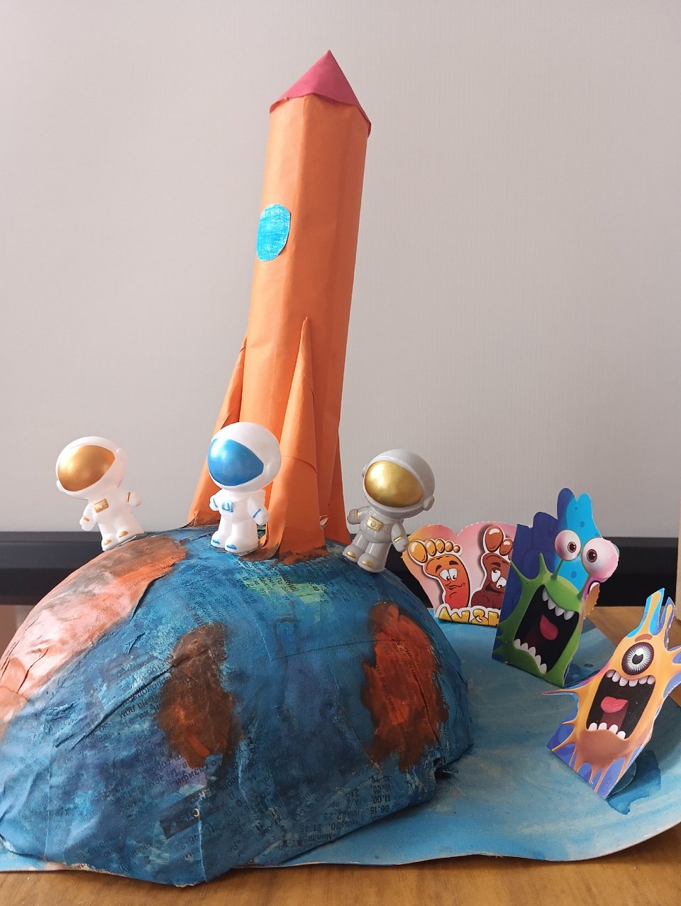 Возраст ребёнка 6 лет. поделка выполнена из папье-маше, цветной бумаги, пластиковых фигурок и цветных изображений. основа из картона.