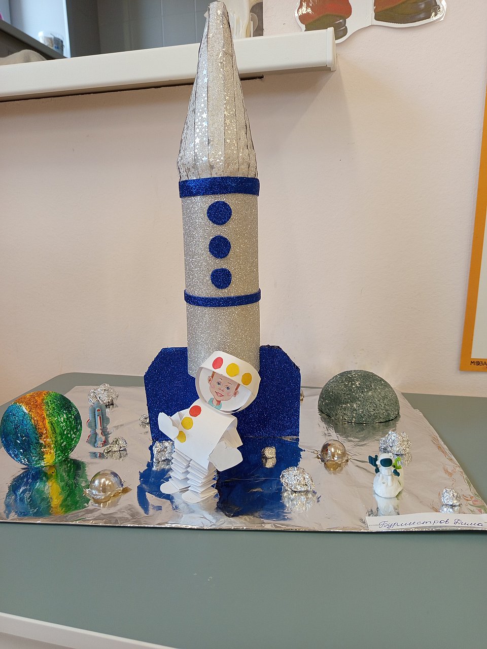Из пенопласта мы сделали часть большого метеорита, так же вид земли мы нарисовали на пенопластовом шаре акриловыми красками. Космонавта мы сделали из бумаги А4, маленькие метеориты из фольги, ракета состоит из упаковки (банки) из под чипсов, конусообразная пластмассовая игрушка, картон, фоамиран ( белого и синего цвета), клей ПВА и клеевые стержни.