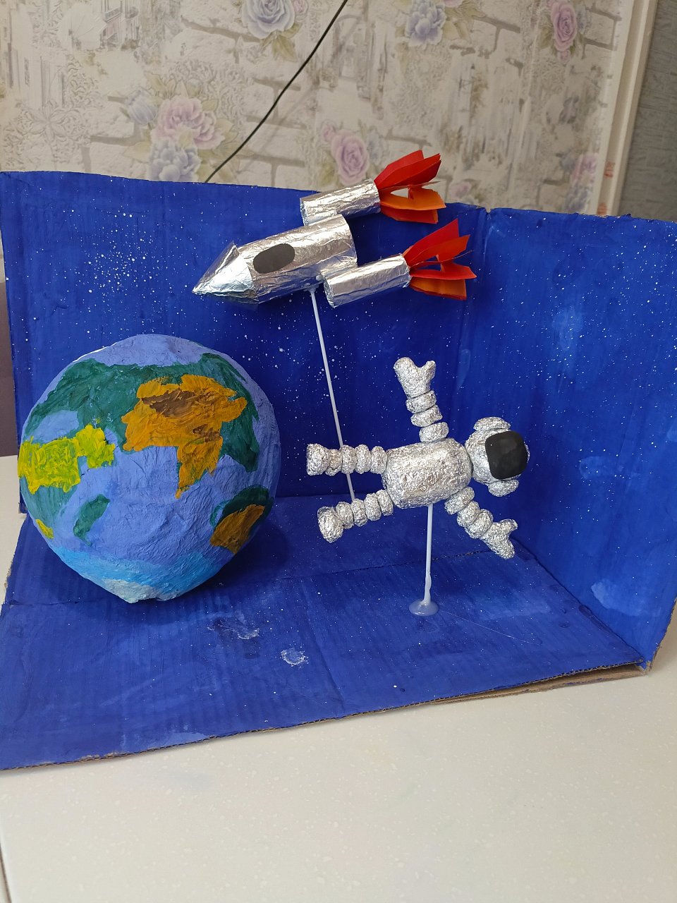 5 лет. Планета в технике папье-маше, космонавт и ракета сделаны из фольги и картона. Использовали коробку, газету, белую бумагу, фольгу, картон, гуашь и клеевой пистолет