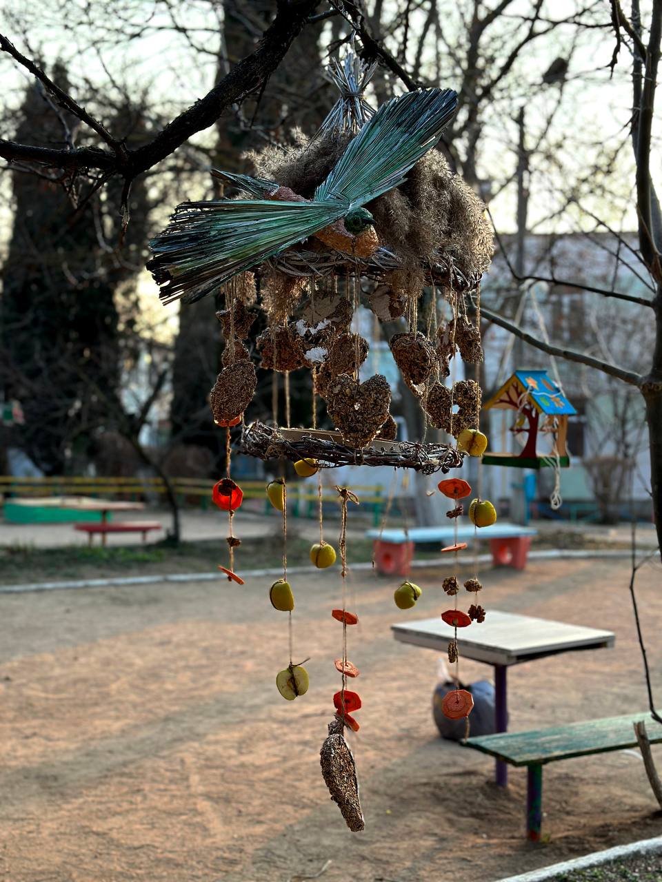 Изготовление работы из экологически чистых кормов для птиц в технике ленд-арт из материалов леса, а также птица - в технике папье-маше. Работа коллективная