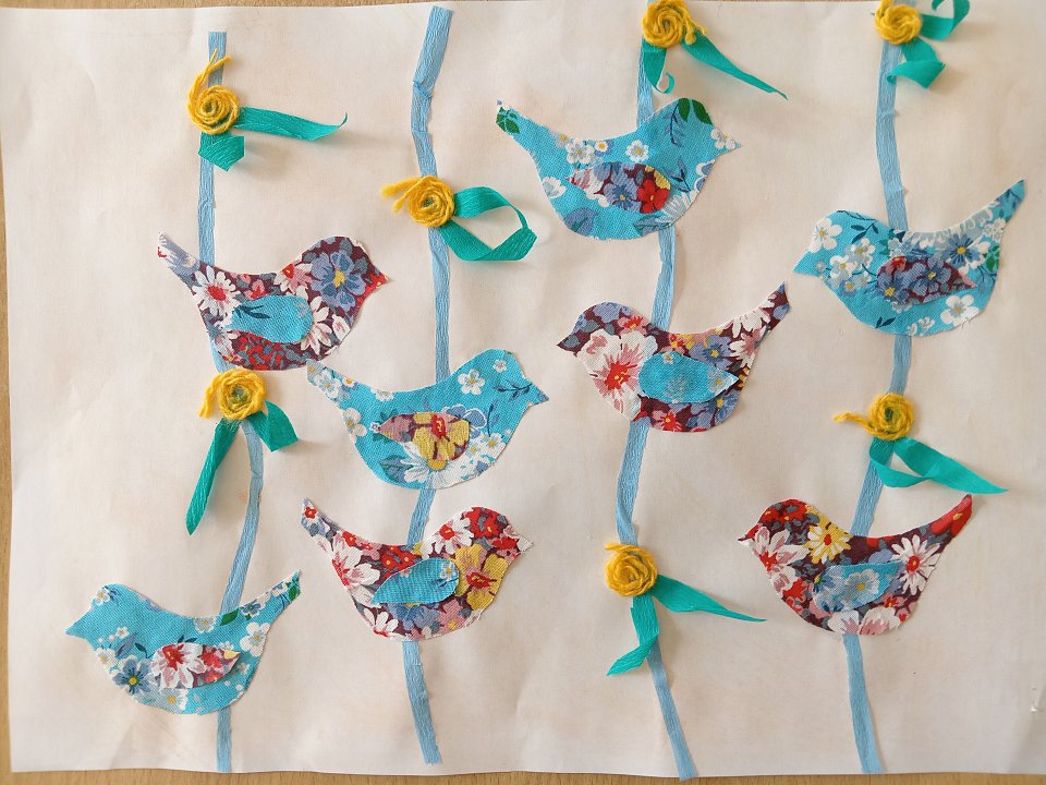 Аппликация выполнена с использование ткани, гафрированной бумаги и ниток.