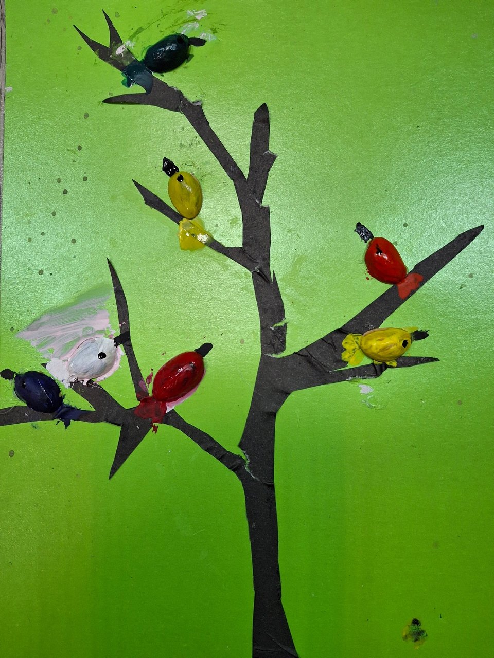 Работа выполнена из бумаги , фисташек и красок.