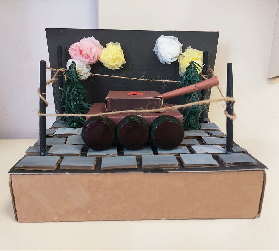 Поделка выполнена из спичечного коробка, обклееная цветной бумагой, цветы из салфеток, огорождение сделано из палочек для суши, и верёвки