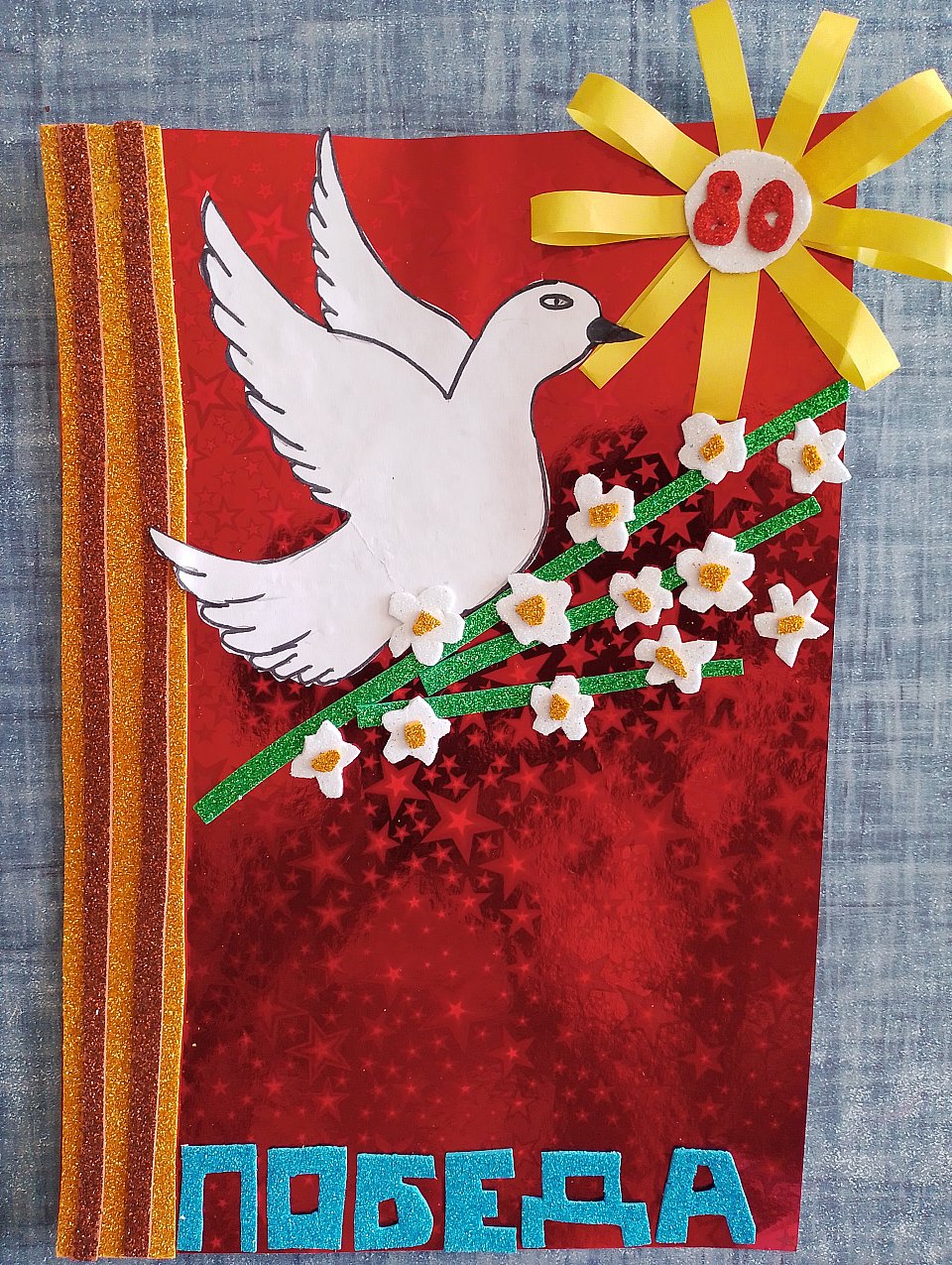 Участнице 7 лет. Работа в технике аппликации. Использована белая и цветная бумага, голографическая цветная бумага, самоклеющийся фоамиран для рукоделия и творчества, белый картон (основа).