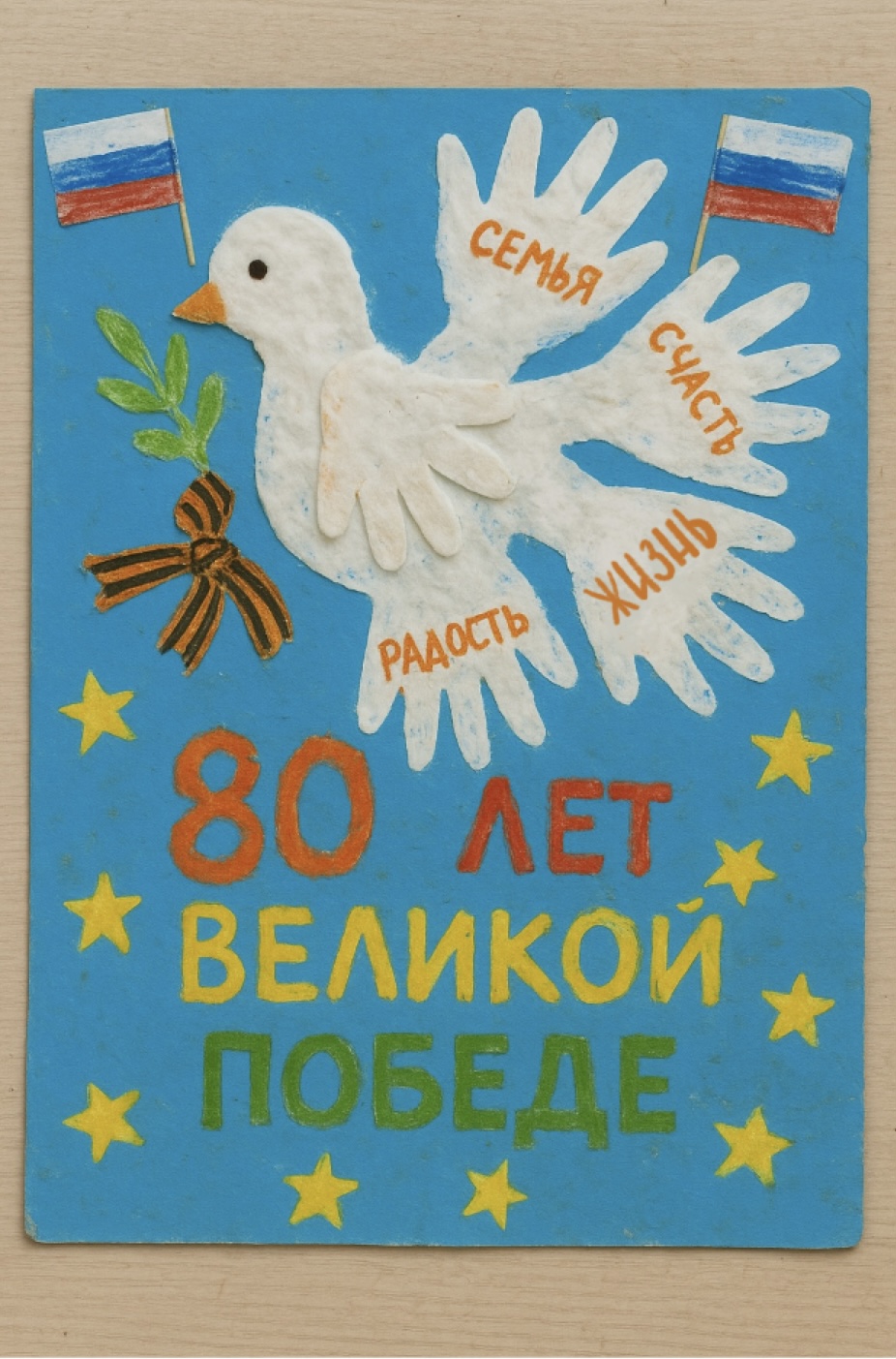 З лет, которые с помощью своих ладошек выразили простые, но важные слова, ради которых завоёвывалась Победа. Мы хотим, чтобы голубь мира всегда парил над нашей страной, а дети росли в мире, радости и любви.