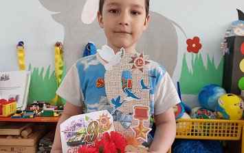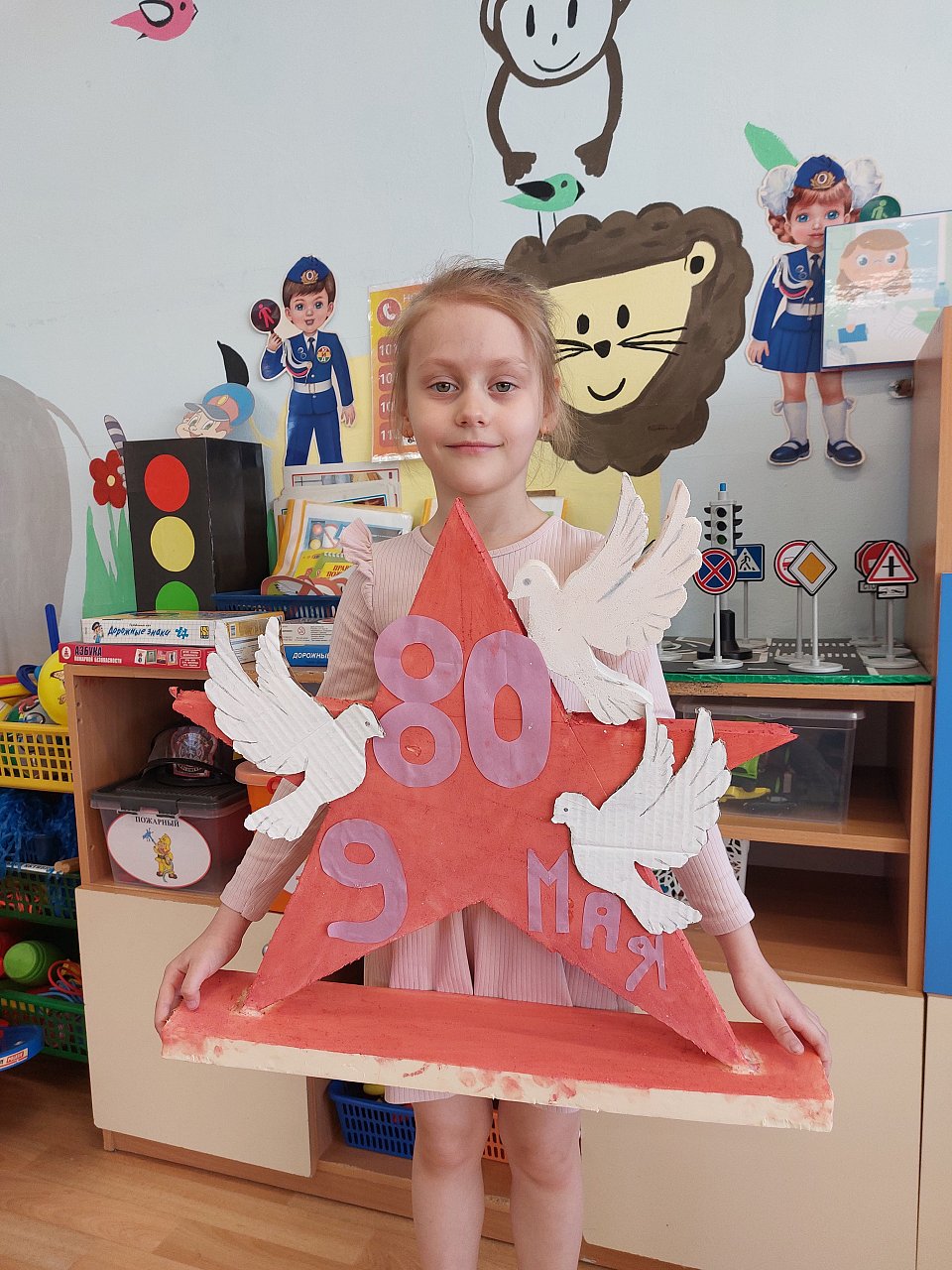 6 лет , поделка сделана из пенопласта , вырезанная звезда - означает победу над фашисткой армией , голуби символизируют мирное небо над головой , Рита самостоятельно раскрашивала звезду красного цвета и вырезала из бумаги цифры - 80 лет Великой Победе.