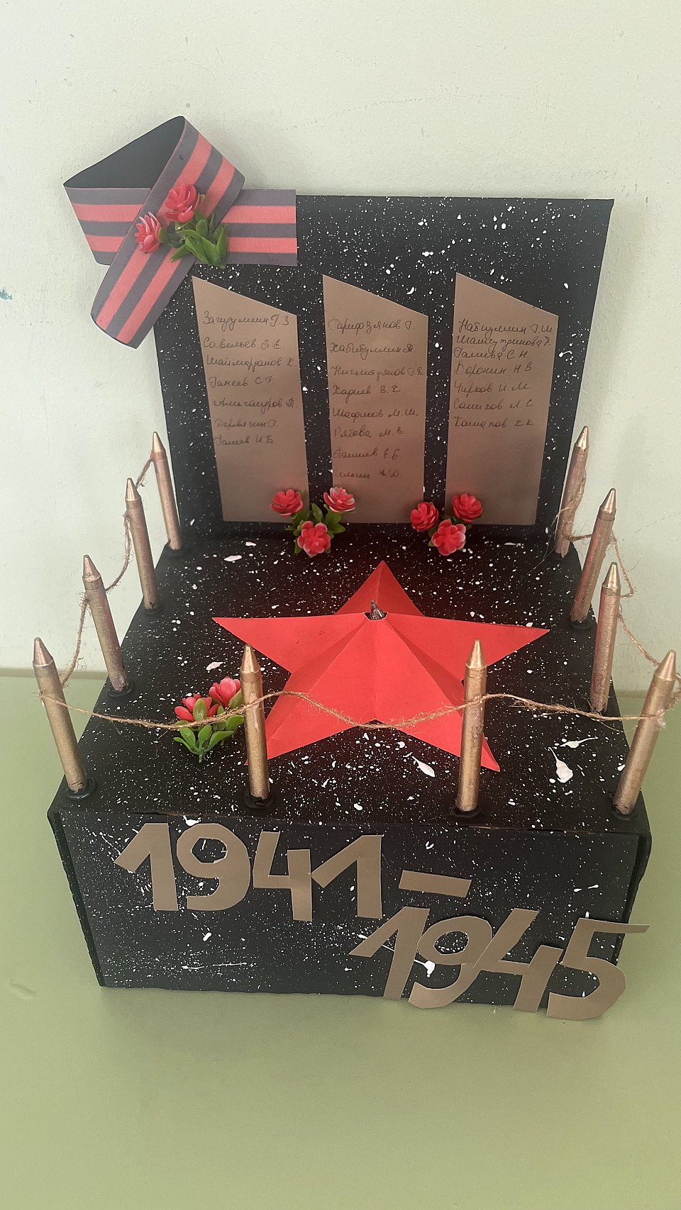 5 лет. Подделка из бросового материала с использованием картона, цветной бумаги, искусственных цветов, металлических игрушечных пуль, веревки.