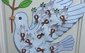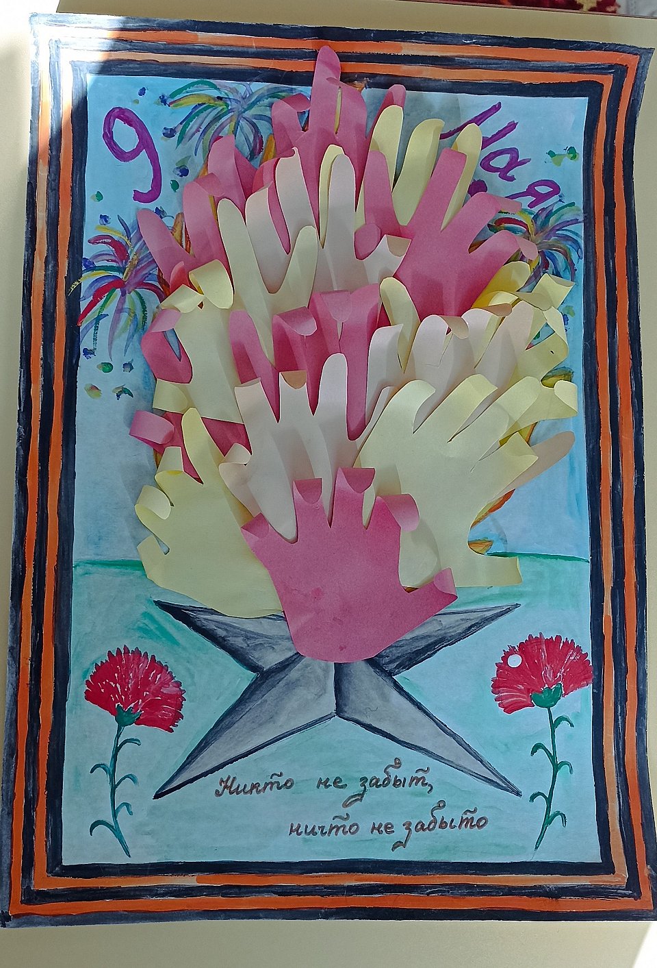 Коллективная работа из ладошке детей 5-7 лет, использовалась бумага "Радуга", гуашь