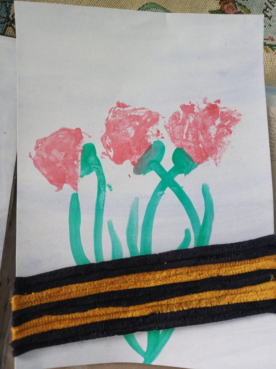 Рисунок выполнен акварелью. Георгиевская лента выполнена из ниток.