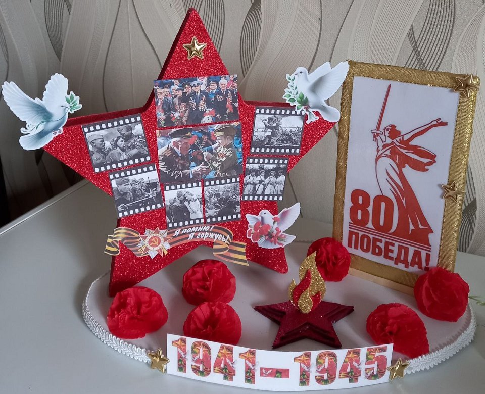 Возраст участника: 4 года, воспитанник дошкольного образования. Поделка. В работе использовались материалы: картон, фоамиран (звезда, вечный огонь) , печать на Цветном принтере (киноплёнка, голуби, георгиевская лента) , гвоздики, рамка"80 лет Победы".