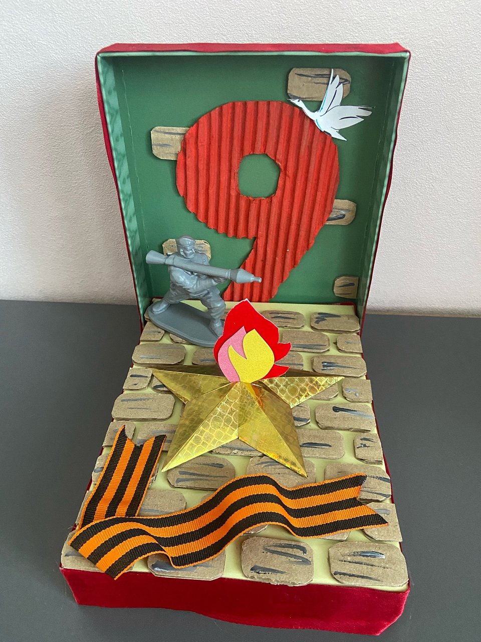 Поделка посвящена Дню Победы и передаёт символы памяти: вечный огонь, журавля как знак погибших героев, георгиевскую ленту – символ мужества, и цифру "9" – напоминание о дате Великой Победы. Работа выполнена в смешанной технике с использованием картона, цветной бумаги и декоративных лент.