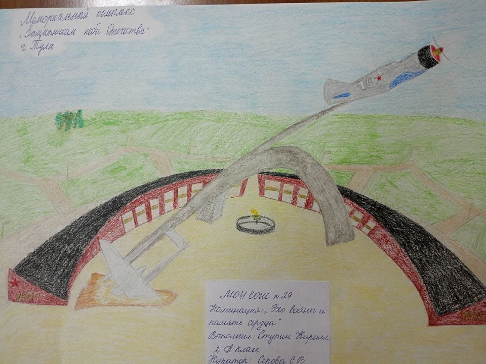 После экскурсии в Тулу художник вдохновился данным мемориалом и изобразил его. Художнику 8 лет. Работа цветными карандашами.