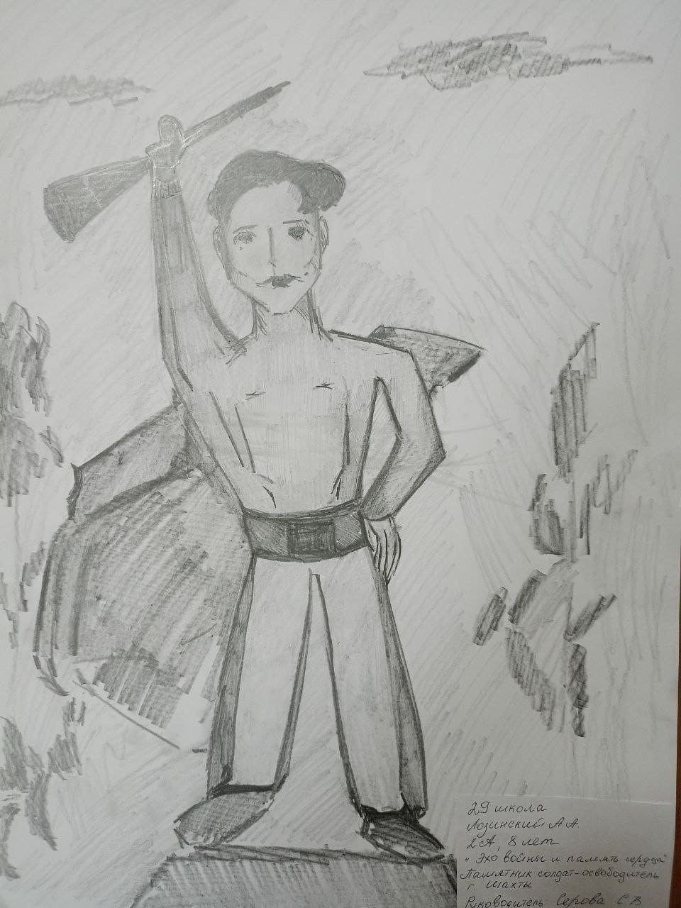 Семья Артёма родом из данного города. Художник был заинтересован и изобразил данный памятник. Артëм 8 лет. Выполнено карандашом.