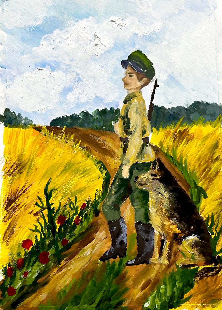 Анна, начинающий художник, 9 лет. Выполнила работу гуашью. На картине изображен солдат со своим верным псом, которые возвращаются в родные края с войны.