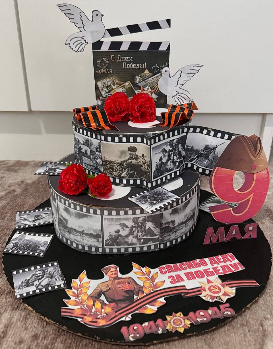 Возраст участника: 8 лет, ученик 1 класса. Для работы использовалась смонтированная из картинок лента Победы, фотопечать и печать киноленты на бумаге А4, картон, Георгиевская лента, гвоздики, голуби.