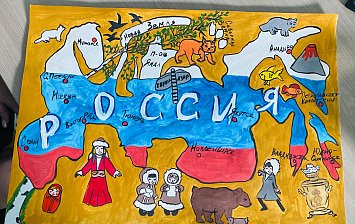 Фломастеры использованы для закрашивания солнца желтым цветом , флаги.. Цветовая гамма яркая.